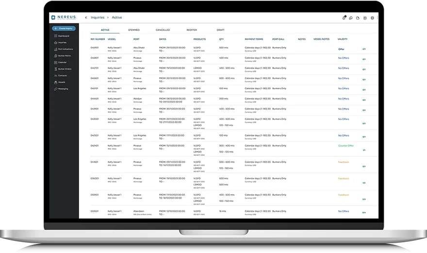 The inquiry management system on NEREUS allows for efficient handling of bunkering inquiries. It enables users to create, track, and manage inquiries from start to finish within the platform. This system streamlines the process, from initial request to final negotiation and agreement, ensuring all steps are organized and easily accessible. This functionality enhances operational efficiency and simplifies the decision-making process in marine fuel procurement.